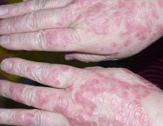 3、关节型牛皮癣:关节病型牛皮癣很少见,任何年龄均可发生,可同时发生于大小关节,但常见是手腕、手指及足趾小关节,脊柱关节也可发生。病变的关节有红肿、疼痛。