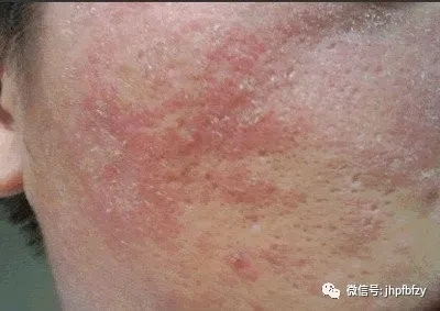 10、激素性依赖皮炎:激索依赖性皮炎亦称酒渣样皮炎,或部分口周皮炎亦包含在内。是由于皮质类固醇激索使用不当或滥用造成的,临床以皮肤弥漫性红斑、毛细血管扩张、针尖样脓疱、皲裂、脱屑、色索异常为特征。