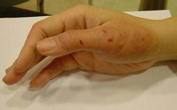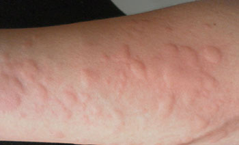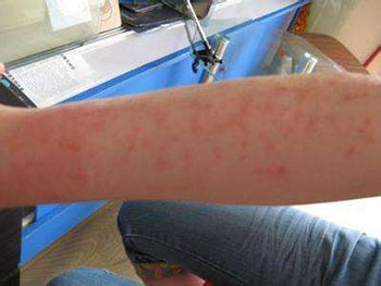 2、丘疹性荨麻疹:丘疹性荨麻疹又称急性单纯性痒疹。典型皮损为绿豆或稍大淡红色丘疹,性质坚硬,顶端常有小疱,搔破后结痂,周围有纺锤形红晕,经搔抓后呈现风团。该病好发于躯干及四肢近端,损害数目不定,常分批出现,散在发生或少数簇集,常伴有胃肠障碍,少数患者有时亦有呈现水疱者。